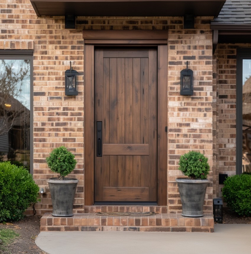 - Входные двери из массива дуба с терморазрывом — абсолютный лидер среди загородных домов. Натуральный дуб дарит эстетичный вид и статус, а терморазрыв защищает от промерзания зимой.